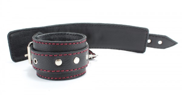 Наручники и оковы выполнены из натуральной кожи в черном цвете. Декор из металлических клепок