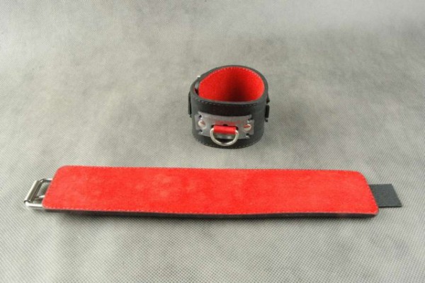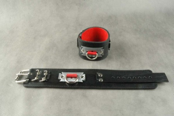 Выполнены наручники из натуральной кожи в черном цвете. Изнутри обшиты контрастным красным велюром. Декорированы наручники кожаной вставкой металлического цвета в виде лезвия, что придает особенный стиль и выглядит весьма элегантно!