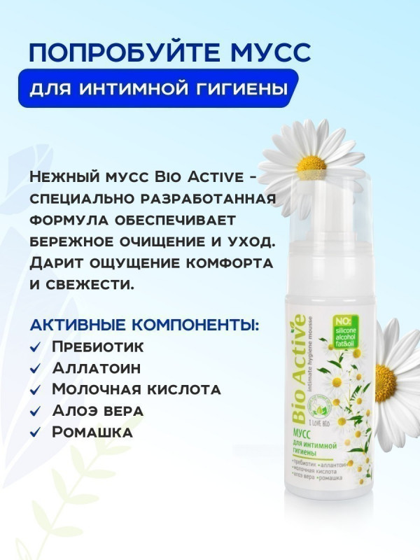 Потрясающий мусс для интимной гигиены "Bio Active" с алоэ вера и ромашкой подарит ощущение свежести и комфорта! Нежная пена деликатно очищает интимные зоны обеспечивая самый бережный уход...